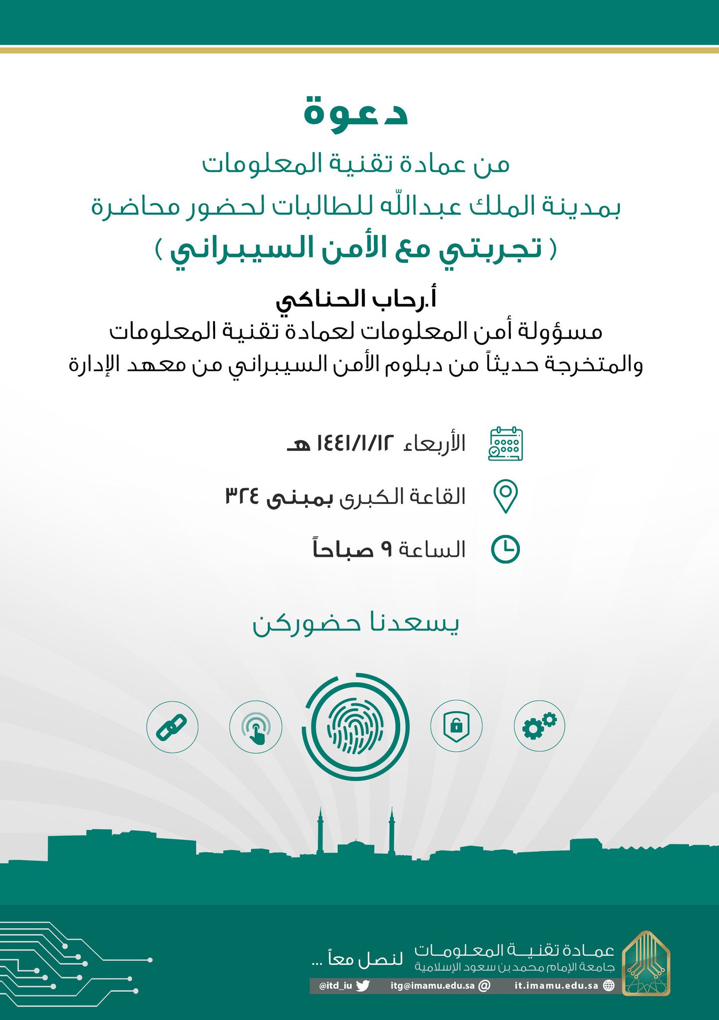 عمادة تقنيةالمعلومات Twitterissa دعوة عامة تقيم عمادة تقنية المعلومات غدا الأربعاء محاضرة عن الأمن السيبراني في مدينة الملك عبدالله للطالبات نتشرف بحضوركن Https T Co I1wxeuoaek